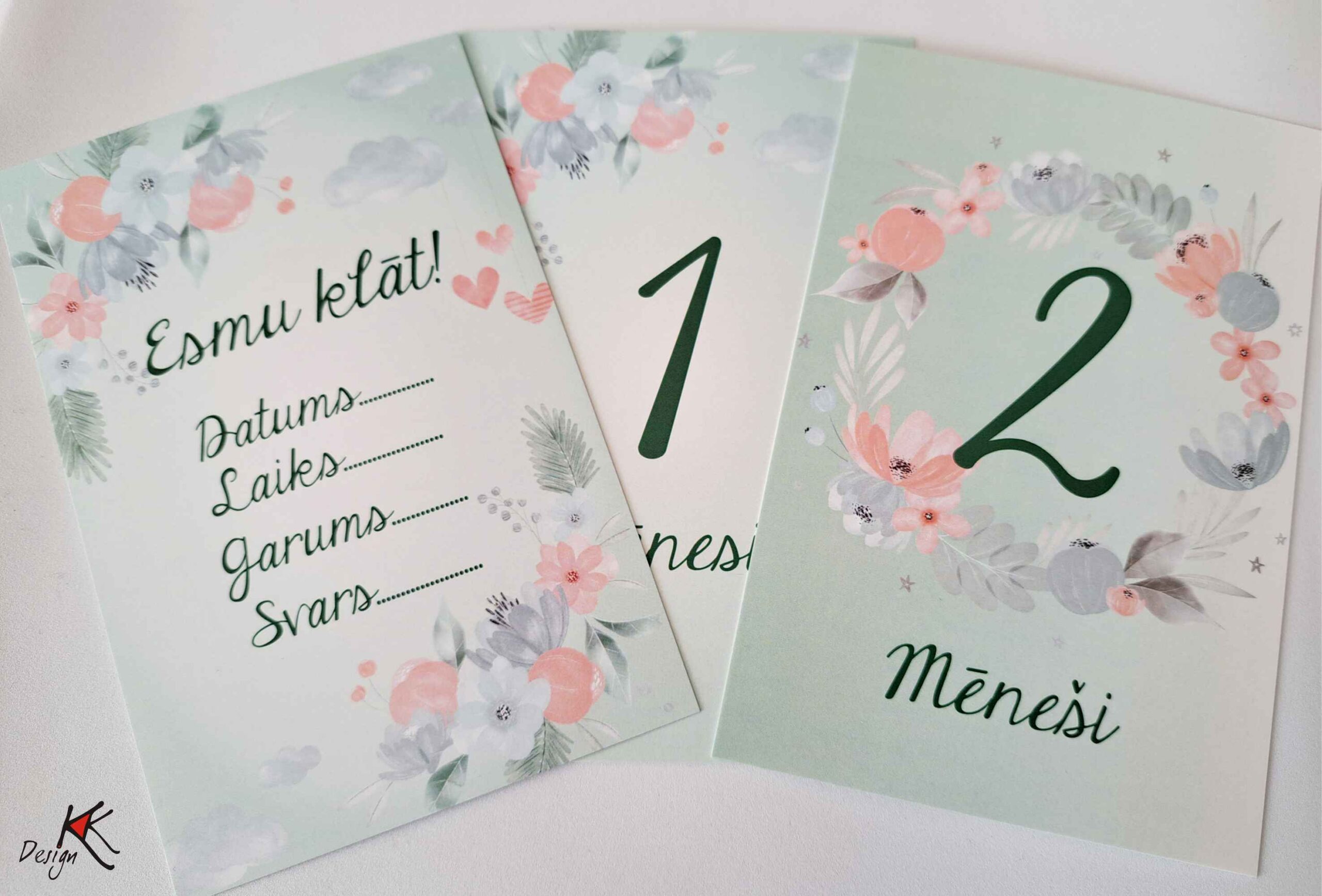 Komplektā ietilpst 12 kartiņas ar katru mēnesi, kā arī viena kartiņa, kad mazulis tikko ir piedzimis!